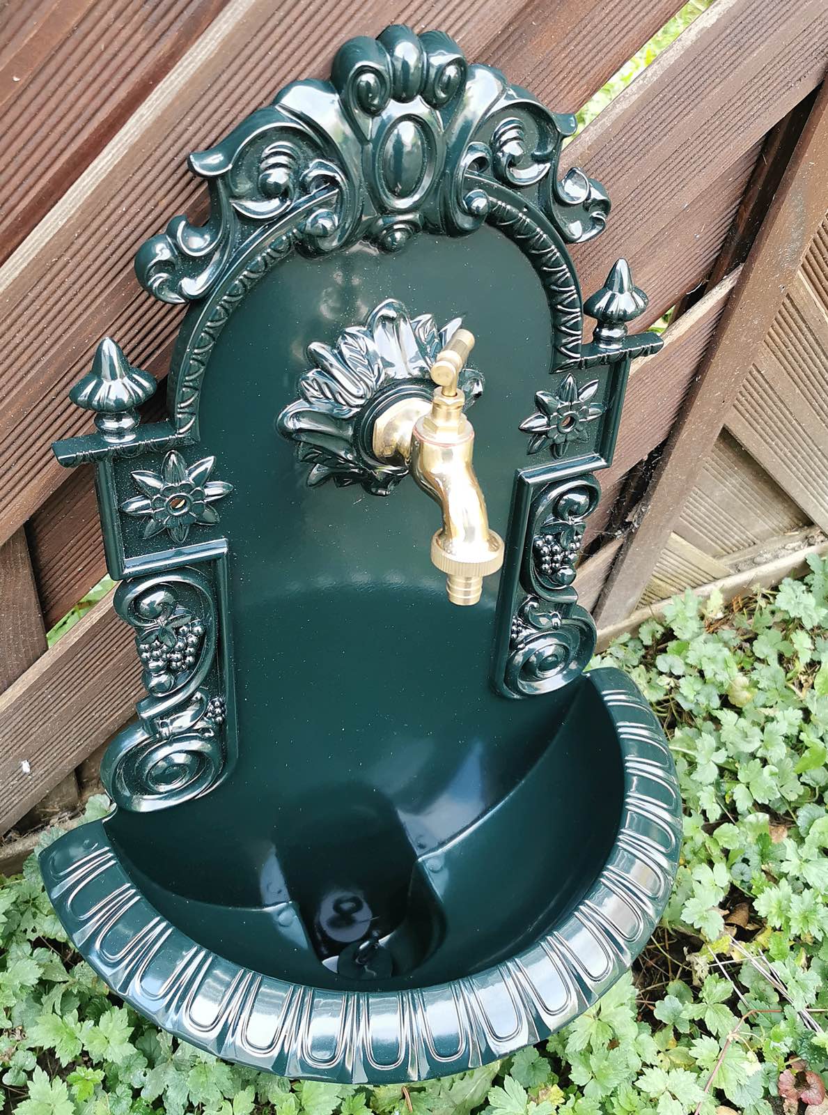 Splendida fontana da giardino a muro in alluminio fuso, realizzata in stile antico. Sui lati è possibile vedere il motivo ornamentale a forma di vitigno. È un grazioso elemento decorativo, come si può vedere dalla foto. Naturalmente il rubinetto è incluso. Le misure sono: Altezza 61 cm, larghezza 37 cm, profondità 21 cm, Peso 2,8 kg. Il diametro interno del tubo dell?acqua è 19 mm, il raccordo è 3/4 pollici.